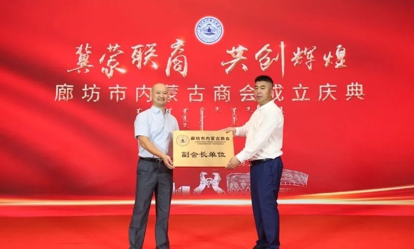 (廊坊市工商聯(lián)常務(wù)副主席魏建為廊坊市內蒙古商會(huì )會(huì )長(cháng)王曉軍授牌 )