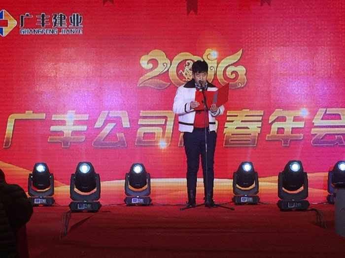下午4點(diǎn)半,伴隨著(zhù)新年的祝福聲、歡呼聲和主持人熱情洋溢的祝福聲,廣豐集團2016新春年會(huì )正式開(kāi)始,集團公司董事長(cháng)王曉軍先生首先致辭,向公司全體員工致以新春的問(wèn)候和美好的祝福。
