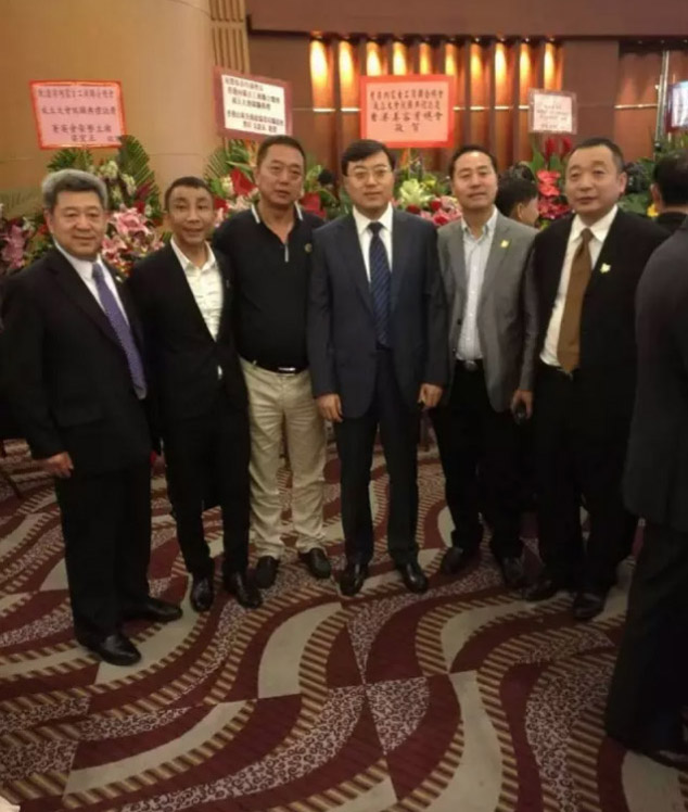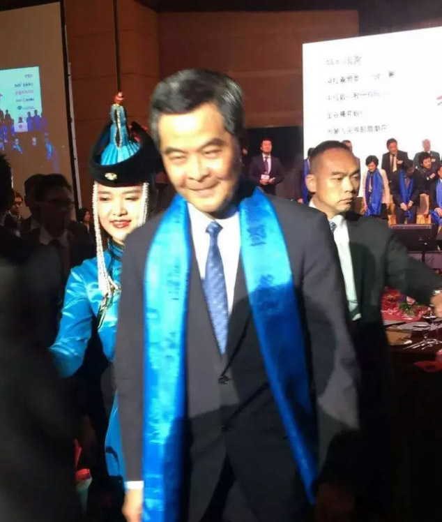 (前排左四為內蒙古自治區主席布小林、左五為香港特首梁振英、左六為香港內蒙古工商聯(lián)合總會(huì )會(huì )長(cháng)陳建文)